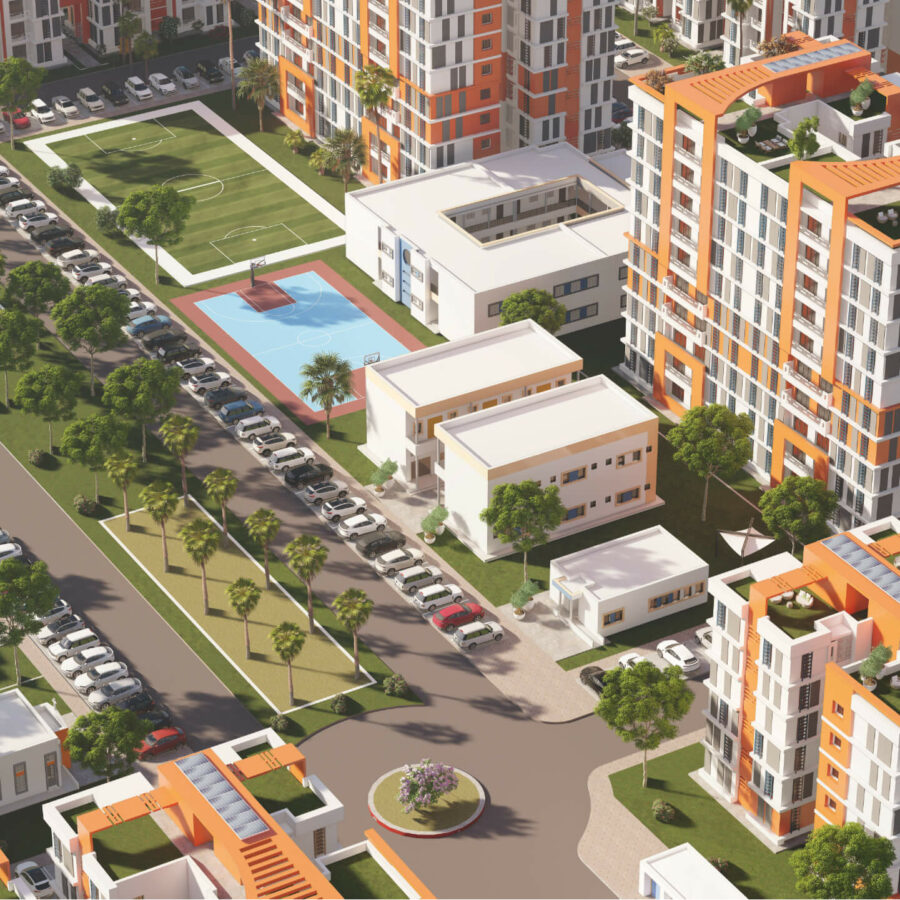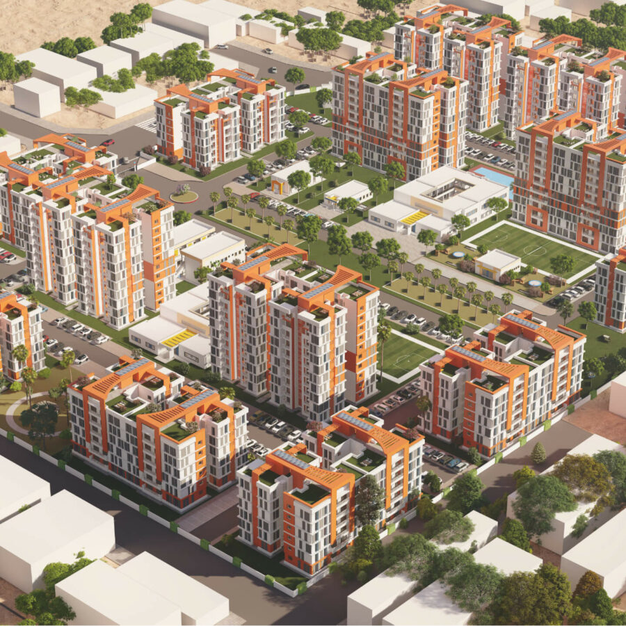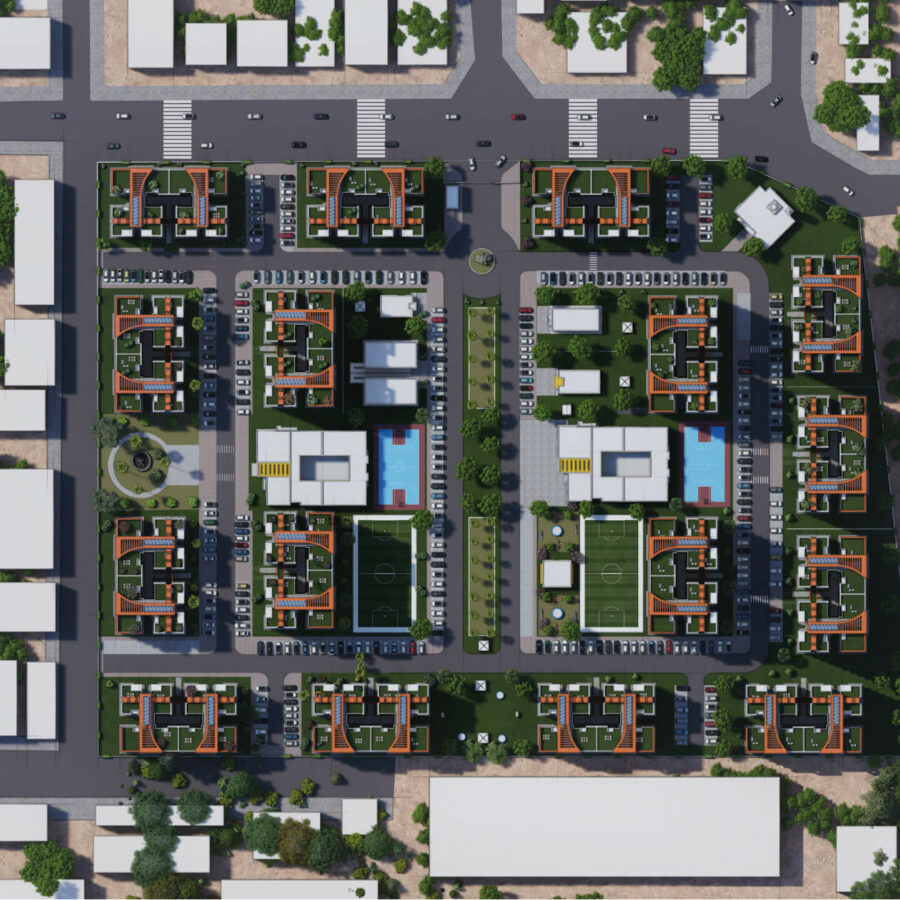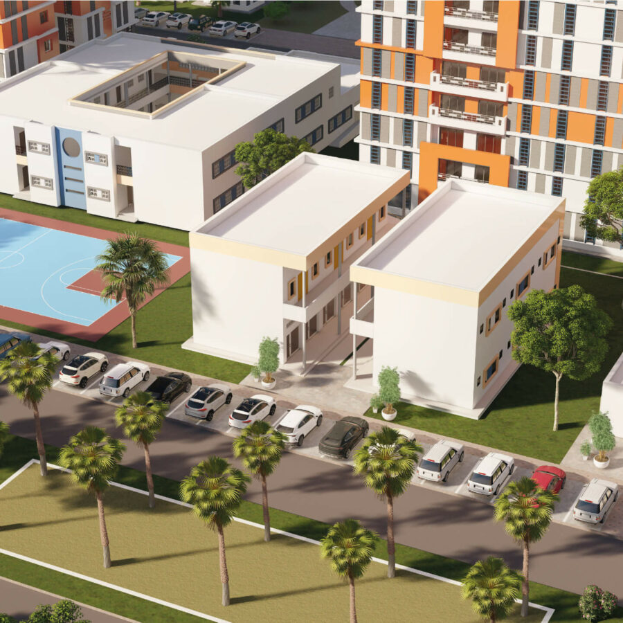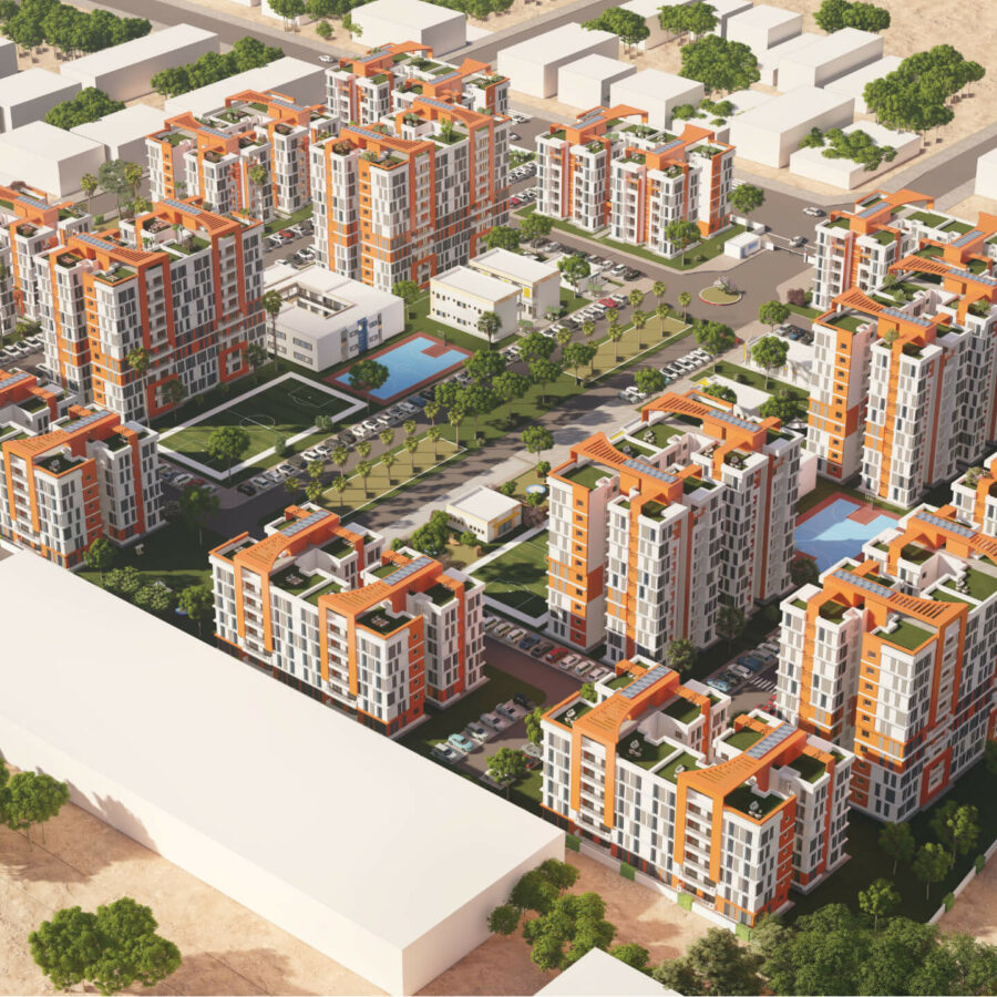 L’organisation spatiale de la résidence s’appuie sur une hiérarchisation claire des espaces, allant de l’espace public à l’espace semi-privé, puis à l’espace privé. Une attention particulière est portée à la sécurité des futurs occupants ainsi qu’à la création d’un cadre de vie agréable, favorisant une résidence aérée où l’ensemble des immeubles s’articule autour d’espaces verts paysagers.
