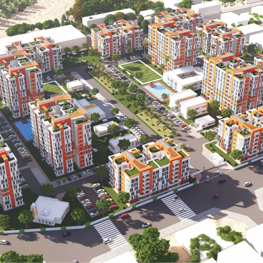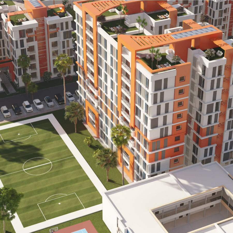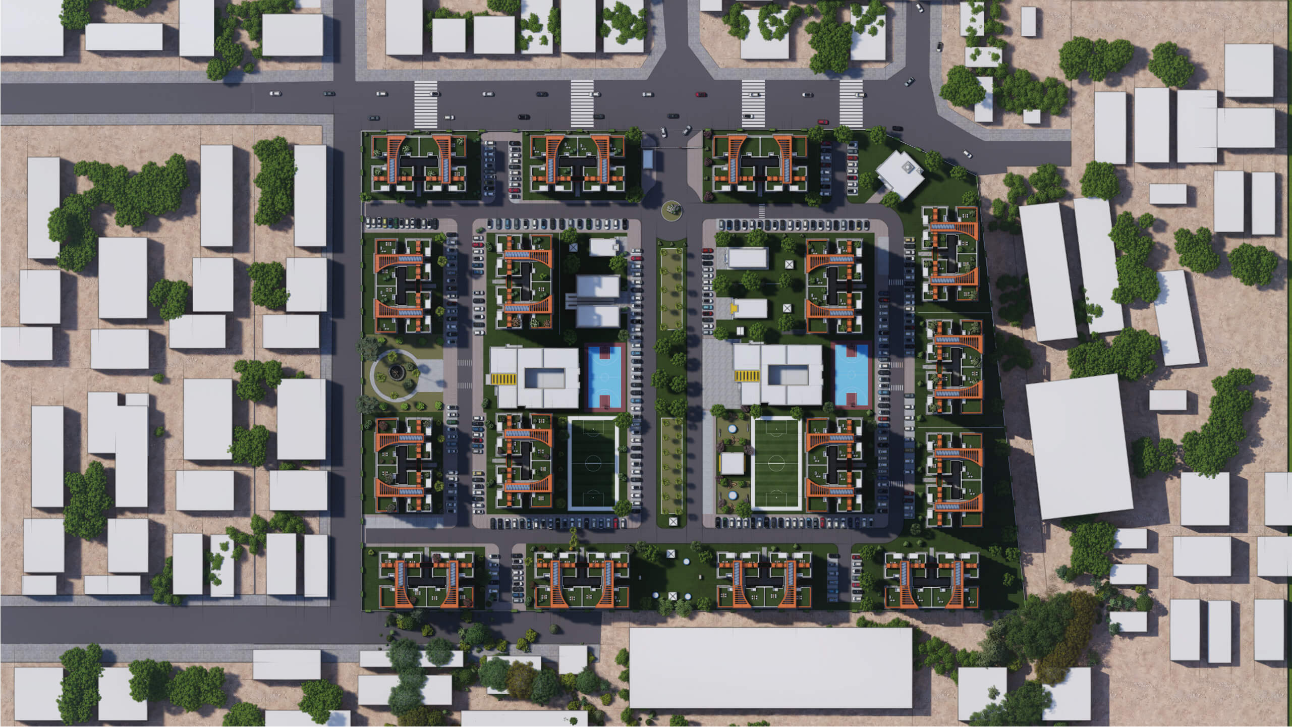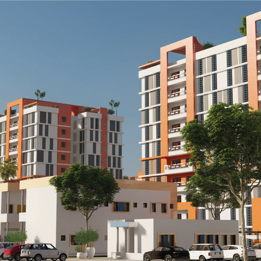 L’organisation spatiale de la résidence s’appuie sur une hiérarchisation claire des espaces, allant de l’espace public à l’espace semi-privé, puis à l’espace privé. Une attention particulière est portée à la sécurité des futurs occupants ainsi qu’à la création d’un cadre de vie agréable, favorisant une résidence aérée où l’ensemble des immeubles s’articule autour d’espaces verts paysagers.