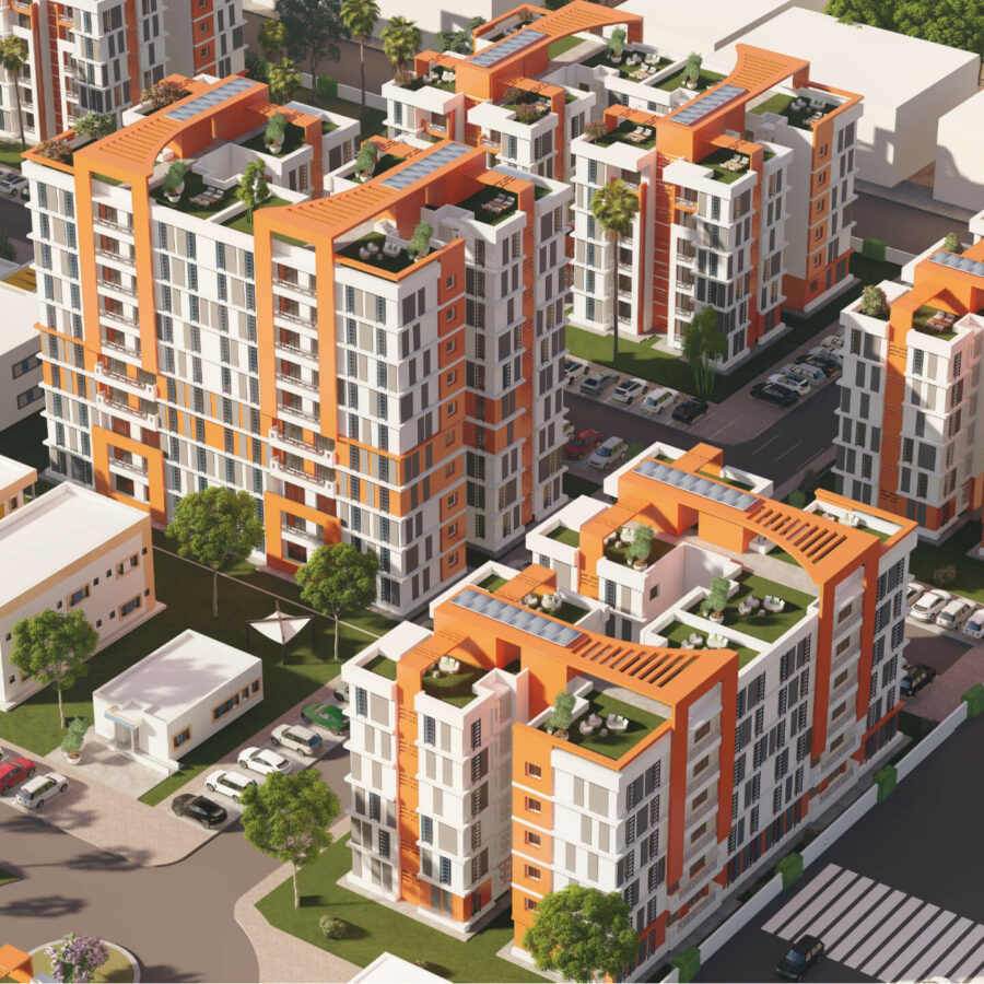 L’ensemble des logements collectifs sociaux et économiques est réparti en plusieurs sous-ensembles d’immeubles, formant des résidences autonomes, chacune disposant de sa propre identité et de ses espaces dédiés.