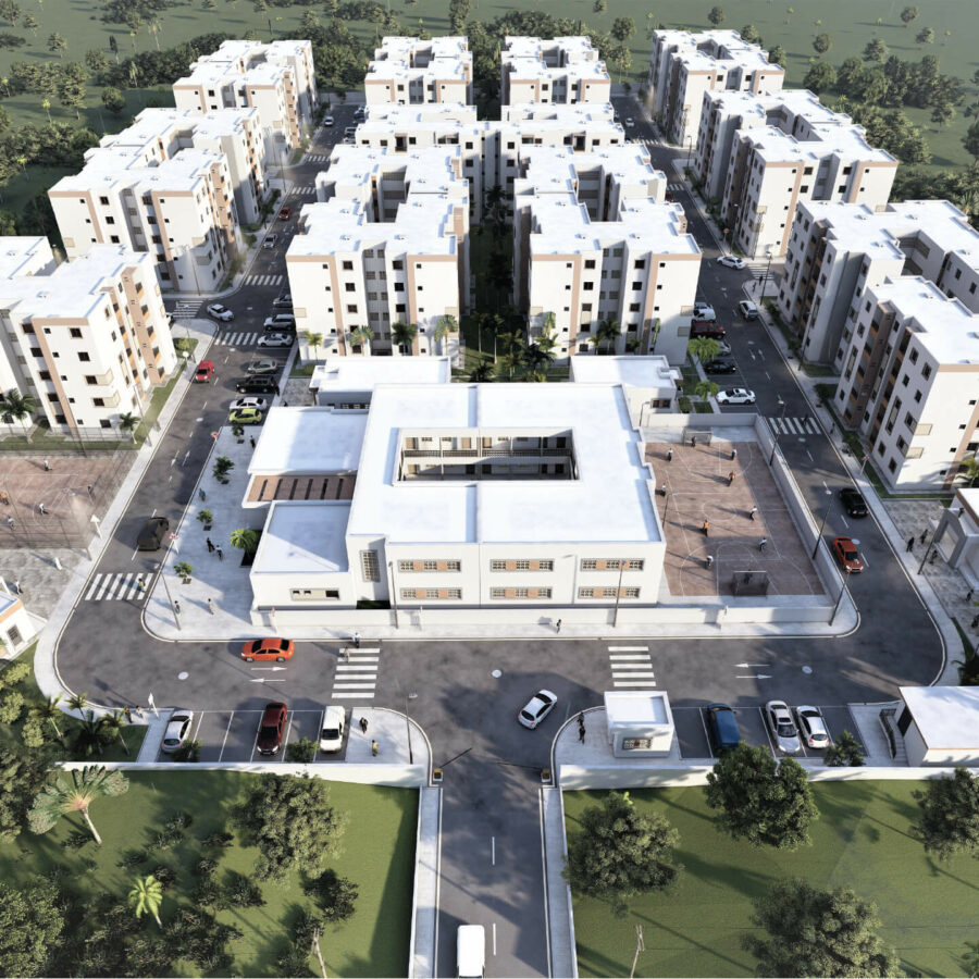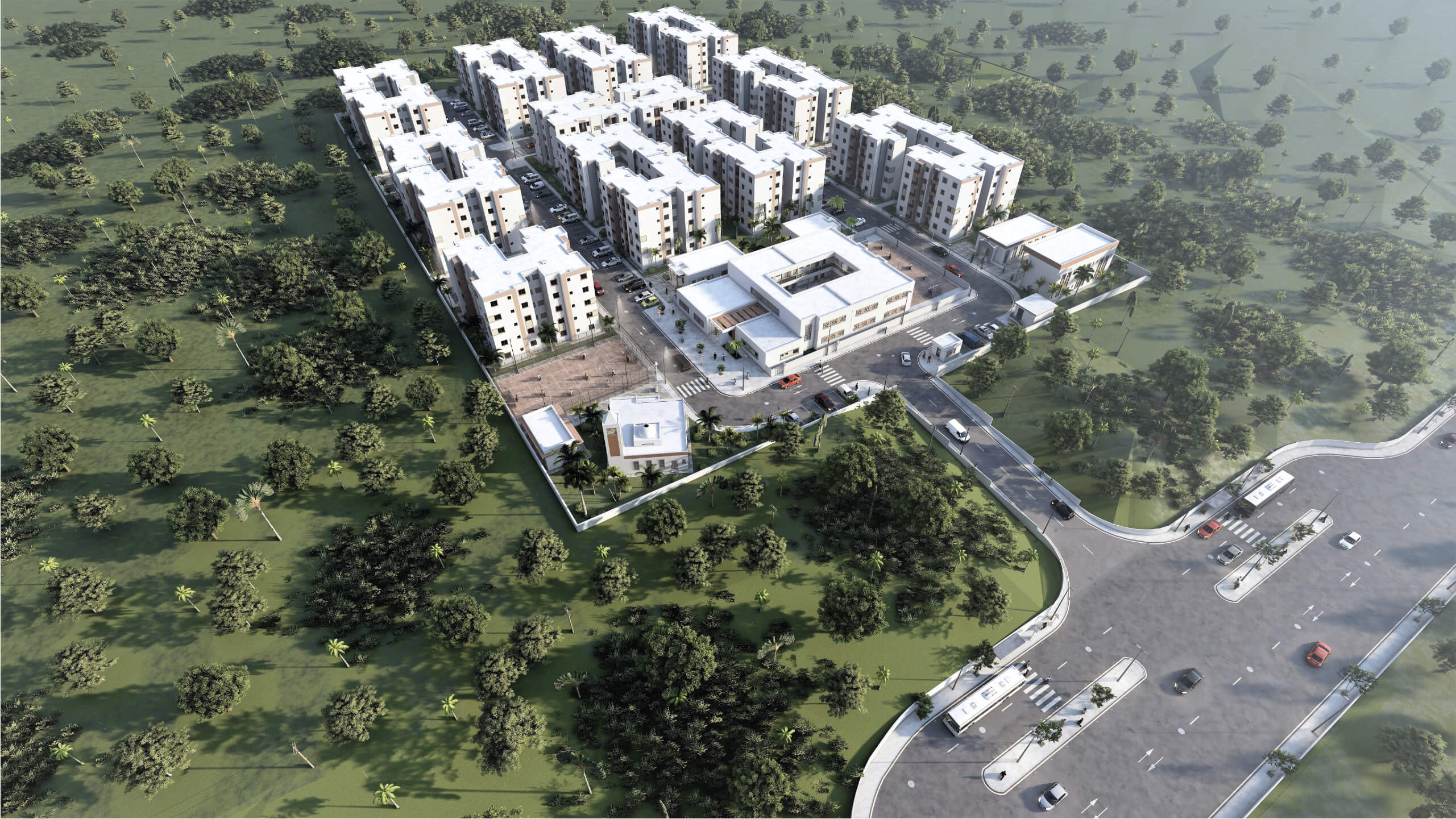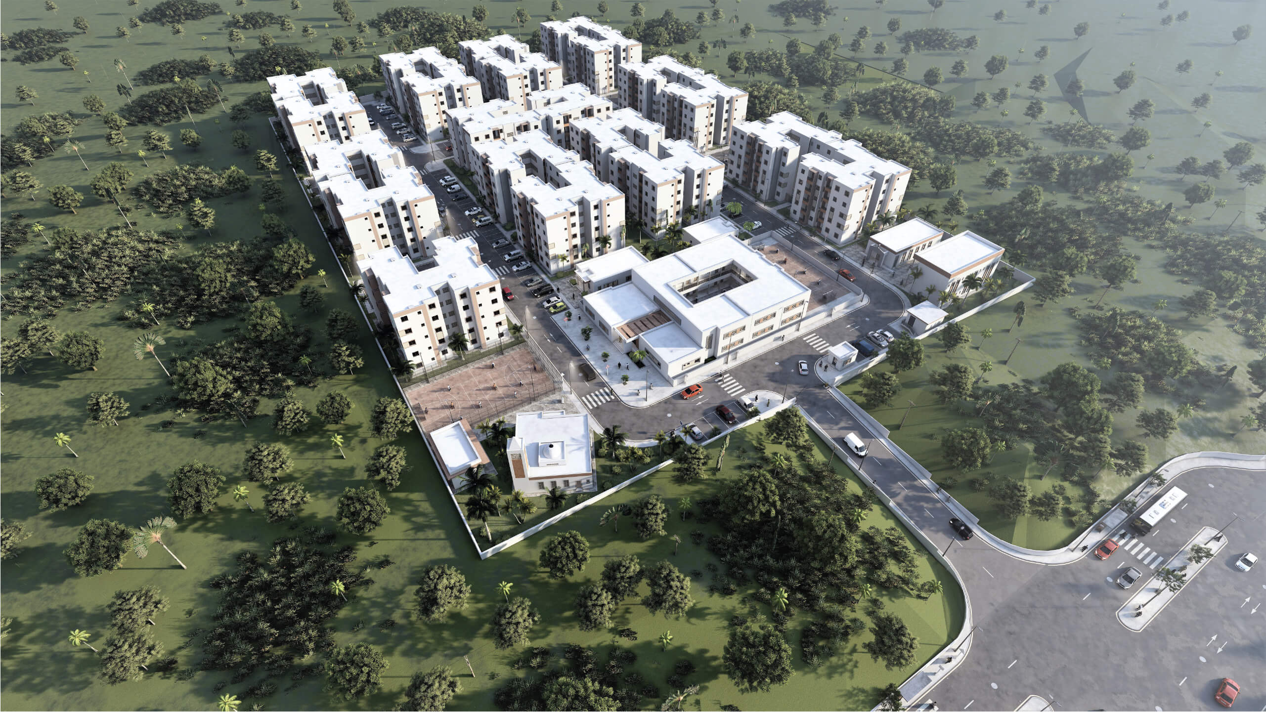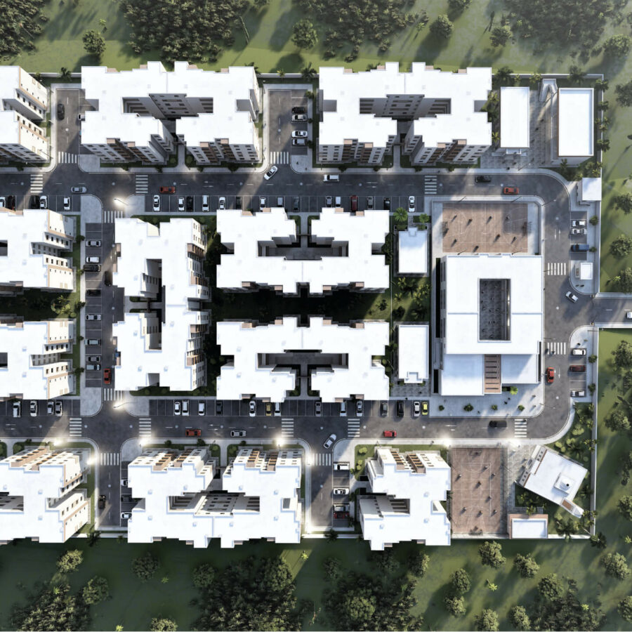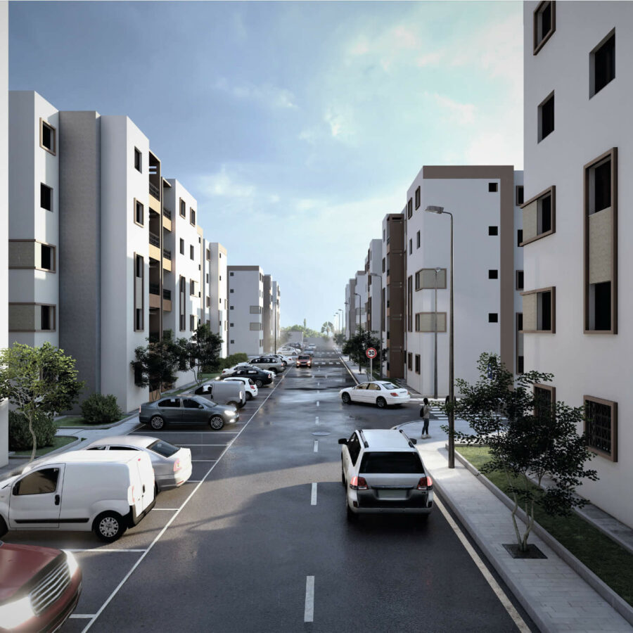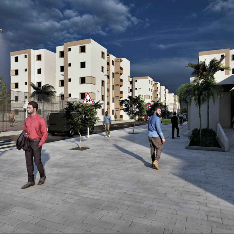 Le projet comprend des immeubles d’habitation collectifs organisés autour d’un maillage viaire clair, intégrant des espaces publics, des équipements de proximité et des zones de stationnement. L’architecture se veut sobre, moderne et adaptée au contexte climatique local, favorisant la ventilation naturelle, l’ensoleillement maîtrisé et la qualité du cadre de vie.