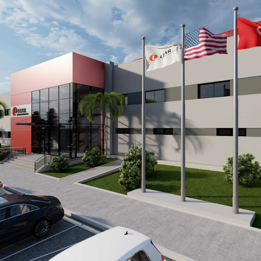 L’usine Lear Trim à Bizerte présente une architecture industrielle fonctionnelle conçue pour accueillir les activités de fabrication et d’assemblage des éléments de garnissage automobile. Le projet repose sur des volumes simples et horizontaux, organisés autour de grands halls de production offrant des espaces libres et flexibles. La structure, majoritairement métallique, permet de larges portées et une adaptabilité des lignes de production. L’enveloppe est traitée en bardage métallique isolé, intégrant des ouvertures linéaires et des dispositifs d’éclairage naturel en toiture afin d’améliorer le confort visuel et thermique. L’organisation architecturale distingue clairement les zones de production, les espaces administratifs et les locaux sociaux, tout en assurant une circulation fluide et sécurisée des flux internes.