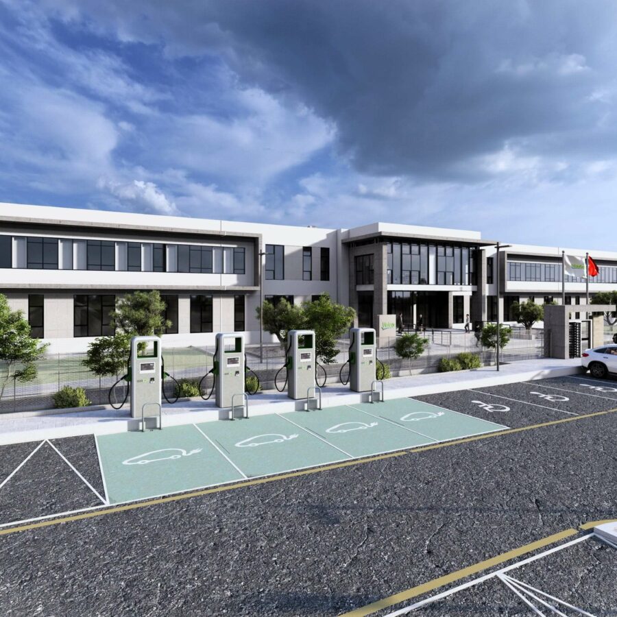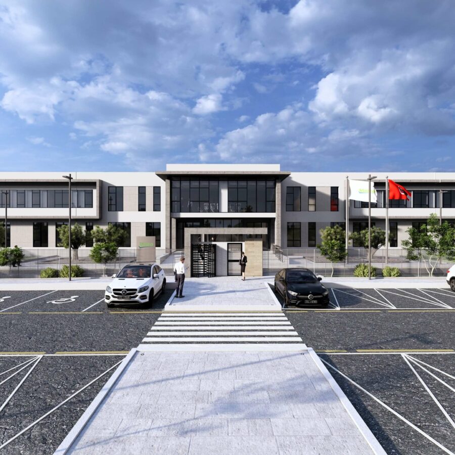 Le front bâti principal, visible depuis l’accès, intègre les blocs administratifs et de services, traités architecturalement par des volumes plus élancés et des façades largement vitrées. Ces éléments vitrés, associés à des brise-soleils horizontaux, confèrent une image institutionnelle et contemporaine à l’usine tout en améliorant le confort thermique et visuel des espaces de travail. L’expression architecturale reste sobre et fonctionnelle, caractérisée par l’utilisation de bardages clairs et de lignes horizontales affirmées.